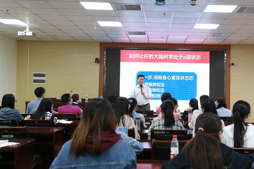 讲座伊始,何教授用幽默风趣的言语向同学们道出影响人们幸福指数的因素有财物、兴趣爱好、工作等。随后,何教授指出,人的终极幸福是不惑与觉悟,如果一个人总是“怕失去"和"想得到"就会把自己陷入痛苦之中;相反,"想得开"和"放得下"将会给人带来幸福。他提醒同学们在备考时不可急于求成,应静心细想学习方法是否正确;不可把目标定得太高,应量力而行。为了让同学们学会了在学习中释放压力,避免焦虑过度而影响成绩,何教授现场教同学们做了一系列有利于放松心情的动作。最后,何教授祝愿同学们学习进步、考研顺利!